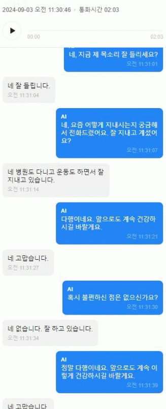 ¡®Å¬·Î¹Ù ÄɾîÄÝ(CLOVA CareCall)¡¯Àº AI(ÀΰøÁö´É) º¸À̽ºº¿À» Ȱ¿ëÇÏ´Â µ¹º½¼ºñ½º·Î, ÁÖ 1ȸ AI°¡ Àüȸ¦ °É¾î °Ç°, ½Ä»ç µî ¾ÈºÎ¸¦ ¹¯°í ½ÇÁ¦ »ç¶÷ó·³ ´ëȸ¦ ÅëÇØ ´ë»óÀÚÀÇ °Ç° »óŸ¦ È®ÀÎÇÏ´Â ¼ºñ½º´Ù.