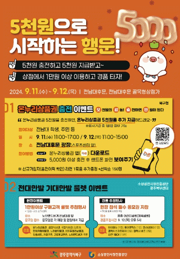 ¡ã¼Ò»ó°øÀνÃÀåÁøÈï°ø´Ü ºÏºÎ¼¾ÅÍ ¡ãÀü³²´ë ÈĹ® °ñ¸ñÇü»óÁ¡°¡ ¡ãÀü³²´ë ÃÑÇлýȸ¿Í Çù·ÂÇØ ÃßÁøµÇ´Â À̹ø Çà»ç´Â ¿Â´©¸®»óǰ±Ç(Ä«µåÇü) 5õ ¿ø ÀÌ»ó ±¸¸ÅÀÚ¿¡°Ô 5õ ¿øÀ» Ãß°¡ ÃæÀüÇØÁÖ´Â ¡®±¸¸Å º¸»ó À̺¥Æ®¡¯¿Í ¡®È«º¸ ºÎ½º¡¯ µîÀÌ ¿î¿µµÉ ¿¹Á¤ÀÌ´Ù.