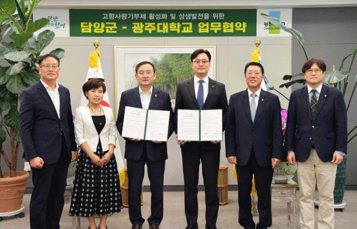 À̳¯ Çù¾à½Ä¿¡´Â ±èµ¿Áø ÃÑÀåÀ» ºñ·ÔÇÑ °ü°èÀÚµéÀÌ Âü¼®ÇßÀ¸¸ç, ±¤ÁÖ´ëÇб³´Â ¼Ò¼Ó ±³Á÷¿øÀ» ´ë»óÀ¸·Î °íÇâ»ç¶û±âºÎÁ¦¸¦ È«º¸ÇÏ°í ´ã¾ç±º¿¡¼´Â È«º¸È°µ¿À» Áö¿øÇϰڴٴ ³»¿ëÀÇ Çù¾àÀ» ÁøÇàÇß´Ù.