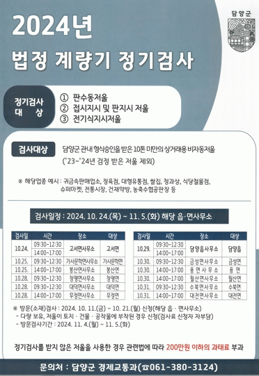 °Ë»ç´Â ´ã¾çÀ¾, ºÀ»ê¸é µî 12°³ À¾¡¤¸é»ç¹«¼Ò¿¡¼ ÁøÇàÇϸç, ºÎÂø½Ä Àú¿ï µî À̵¿ÀÌ ¾î·Æ°Å³ª ´Ù¼öÀÇ Àú¿ïÀÌ ÀÖ´Â °æ¿ì¿¡´Â 10¿ù 21ÀϱîÁö ÇØ´ç À¾¡¤¸é»ç¹«¼Ò¿¡ ¹æ¹® °Ë»ç(¼ÒÀç °Ë»ç)¸¦ ½ÅûÇϸé 11¿ù 4ÀϺÎÅÍ 5ÀϱîÁö °Ë»ç¸¦ ÁøÇàÇÒ ¿¹Á¤ÀÌ´Ù.