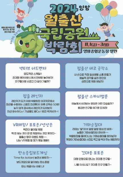 ¿ùÃâ»ê±¹¸³°ø¿øÀ» Áß½ÉÀ¸·Î Àü±¹ 23°³ ±¹¸³°ø¿øÀÇ ÀÚ¿¬¡¤»ýÅ¡¤¹®È °¡Ä¡¸¦ ÀüÆÄÇϰí, ±âÈÄÀ§±â ±Øº¹°ú ź¼ÒÁ߸³ ½ÇõÀ» ¸ð»öÇÏ´Â À̹ø ¹Ú¶÷ȸ°¡ ¾î¸°ÀÌ µî ¹Ì·¡¼¼´ë°¡ üÇèÇÒ ¼ö ÀÖ´Â ´Ù¾çÇÑ ÇÁ·Î±×·¥À» ¿¹°íÇÏ°í ³ª¼± °Í.