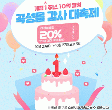°í°´ ¼º¿ø¿¡ º¸´äÇϰíÀÚ °î¼º¸ô¿¡¼´Â 10¿ù 23ÀϺÎÅÍ 10¿ù 27ÀϱîÁö ¡®°³Á¡ 1ÁÖ³â, ¸ÅÃâ 10¾ï ´Þ¼º ±â³ä¡¯ °î¼º¸ô °¨»ç ´ëÃàÁ¦ Àü ǰ¸ñ 20% ÇÒÀÎ Çà»ç¸¦ ÁøÇàÇÑ´Ù. ¶ÇÇÑ °í°´°ú ÇÔ²² °î¼º¸ô 1ÁÖ³âÀ» ÃàÇÏÇϰíÀÚ¡®»ïÇà½Ã À̺¥Æ®¡¯¸¦ ÅëÇØ 20¸í¿¡°Ô ´Ü°¨ 5kgÀ» ÁõÁ¤ÇÑ´Ù.