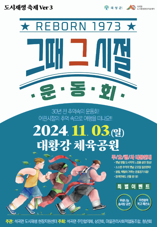 ¼®°î µµ½ÃÀç»ý ÁÖ¹ÎÇùÀÇü, û³âȸ, »óÀÎȸ, ¼®°îµ¹½Ç ¸¶À»°ü¸®»çȸÀûÇùµ¿Á¶ÇÕÀÌ ÁÖÃÖÇÏ°í ¼®°î¸é µµ½ÃÀç»ýÇöÀåÁö¿ø¼¾ÅͰ¡ ÁÖ°üÇÏ´Â À̹ø ÃàÁ¦´Â ¼®°î ÁֹΠ300¿© ¸íÀÌ Âü¼®ÇÏ¿©¡°±×¶§ ±× ½ÃÀý Reborn_1973¡±À̶ó´Â ÁÖÁ¦·Î 1970³â´ë °ÔÀÓ, üÇè ÇÁ·Î±×·¥, µµ½ÃÀç»ý OX ÄûÁî, Ãß¾ï ¼ÓÀÇ »çÁø°ü, º¹°íÆÐ¼Ç¼î µî Ãß¾ïÀÇ ¿îµ¿È¸ ÇÁ·Î±×·¥ÀÌ ÁøÇàµÉ ¿¹Á¤ÀÌ´Ù.