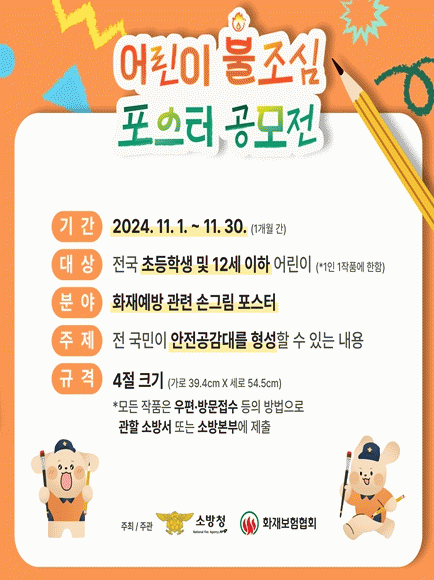 °ø¸ðÀü ±â°£Àº 2024³â 11¿ù 1ÀϺÎÅÍ 11¿ù 22ÀϱîÁö·Î, ÇØ³²Áö¿ª ÃʵîÇлý ¹× 12¼¼ ÀÌÇÏ ¾î¸°À̶ó¸é ´©±¸³ª Âü¿©ÇÒ ¼ö ÀÖ´Ù. Âü°¡ÀÚ´Â ¾î¸°ÀÌ´Ù¿î ÈÀç ¿¹¹æÀ» ÁÖÁ¦·Î 4Àý Å©±âÀÇ ¼Õ±×¸² Æ÷½ºÅ͸¦ ±×·Á Á¦ÃâÇÏ¸é µÈ´Ù.