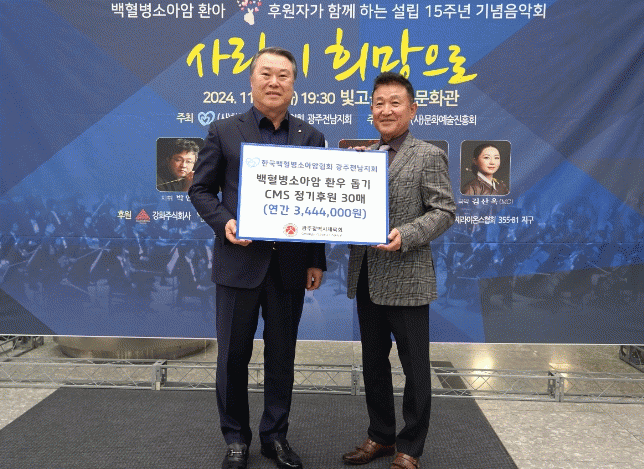 [¹Ìµð¾îÀü³² Á¦°¥´ëÁ¾ ±âÀÚ]±¤ÁÖ±¤¿ª½ÃüÀ°È¸´Â Çѱ¹¹éÇ÷º´¼Ò¾Æ¾ÏÇùȸ ±¤ÁÖÀü³²Áöȸ¿¡ ¹éÇ÷º´ ¼Ò¾Æ¾Ï ȯ¾ÆµéÀ» µ½±â À§ÇÑ ±âºÎ±Ý 344¸¸¿øÀ» Àü´ÞÇß´Ù°í 12ÀÏ ¹àÇû´Ù.