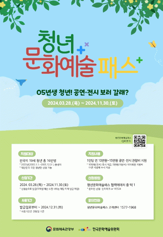 ¡®Ã»³â¹®È¿¹¼úÆÐ½º¡¯ »ç¾÷Àº »çȸ¿¡ ù¹ßÀ» ³»µó´Â û³â¿¡°Ô ¹®È¿¹¼ú ÇâÀ¯ ±âȸ¸¦ Á¦°øÇϱâ À§ÇØ ¿¹¼ú ºÐ¾ß °ø¿¬(¿¬±Ø¡¤¹ÂÁöÄá¤Å¬·¡½Ä¡¤¿ÀÆä¶ó¡¤¹ß·¹¡¤¹«¿ë¡¤ÇÕ⡤±¹¾Ç µî)°ú Àü½Ã °ü¶÷ºñ¸¦ ¿¬°£ ÃÖ´ë 15¸¸ ¿ø Áö¿øÇϸç, ¿ÃÇØ ÃÖÃÊ·Î ½ÃÇàÇÏ´Â »ç¾÷ÀÌ´Ù.