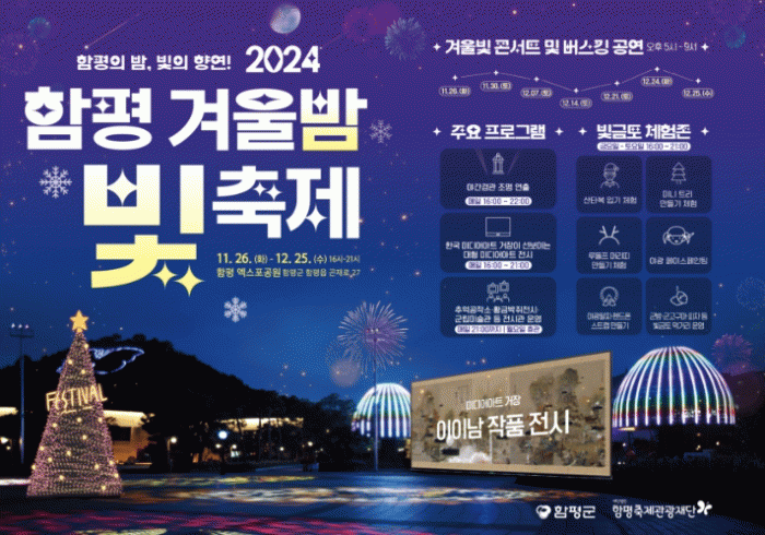 ¡®2024 ÇÔÆò °Ü¿ïºûÃàÁ¦¡¯´Â ÇÔÆò¿¢½ºÆ÷°ø¿ø¿¡¼ 11¿ù 26ÀϺÎÅÍ 12¿ù 25ÀϱîÁö ¿¸®¸ç, °Ü¿ï¹ãÀ» µû¶æÇÏ°Ô ¹àÈú ´Ùä·Î¿î ºû Á¶Çü¹°°ú ÇÔ²² ÇÔÆòÀ» ã´Â °ü±¤°´µé¿¡°Ô Ưº°ÇÑ °Ü¿ïÀÇ Ãß¾ïÀ» ¼±»çÇÒ ¿¹Á¤ÀÌ´Ù.