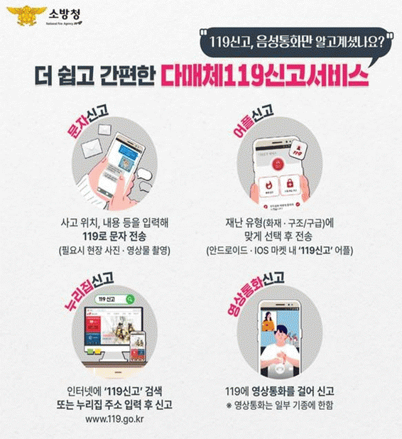 ¡®119 ´Ù¸Åü ½Å°í ¼ºñ½º¡¯´Â ¿µ»óÅëÈ, ¹®ÀÚ, ½º¸¶Æ®Æù ¾Û µî ¿©·¯ ¸Åü¸¦ ÅëÇØ ¾ðÁ¦ ¾îµð¼³ª ¼Õ½±°Ô 119¿¡ ½Å°íÇÒ ¼ö ÀÖ´Â ½Ã½ºÅÛÀ¸·Î, û°¢Àå¾ÖÀÎÀ̳ª ¿Ü±¹ÀÎ µî À½¼º ½Å°í°¡ ¾î·Á¿î °æ¿ì¿¡µµ ±ä±Þ »óȲÀ» ½Å¼ÓÇÏ°Ô Àü´ÞÇÒ ¼ö ÀÖµµ·Ï µ½´Â´Ù.