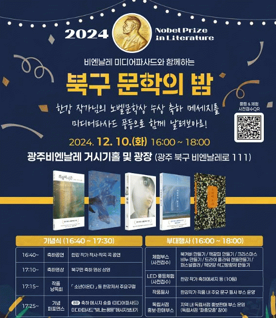 28ÀÏ ºÏ±¸¿¡ µû¸£¸é ´Ù°¡¿À´Â ¡®ÇѰ ÀÛ°¡ ³ëº§¹®Çлó ½Ã»ó½Ä¡¯À» ±â³äÇÏ¿© ¿À´Â 12¿ù 10ÀÏ ¿ÀÈÄ 4½Ã ±¤ÁÖºñ¿£³¯·¹ °Å½Ã±âȦ°ú ºñ¿£³¯·¹ ±¤Àå¿¡¼ ¡®¹Ìµð¾îÆÄ»çµå¿Í ÇÔ²²ÇÏ´Â ºÏ±¸ ¹®ÇÐÀÇ ¹ã¡¯ Çà»ç°¡ °³ÃֵȴÙ.