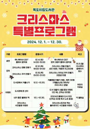 ¶Ç, °Á·δ 12ÀÏ ¼ºÀÎÀ» ´ë»óÀ¸·Î ¡®Å©¸®½º¸¶½º ĵµé ¸¸µé±â¡¯¿Í 19ÀÏ Ãʵî»ýÀ» ´ë»óÀ¸·Î ¡®Å©¸®½º¸¶½º ÄíŰ ¸¸µé±â¡¯°¡ ÁøÇàµÇ¸ç, ¾î¸°ÀÌ ÀÚ·á½Ç¿¡¼´Â ¸ÅÁÖ °Ü¿ï¿ëǰ ¸¸µé±â üÇè Ȱµ¿ÀÎ ¡®µµ¼°ü¿¡¼ °Ü¿ï³ª±â¡¯¿Í ´ëÃâÀÚ¸¦ ´ë»óÀ¸·Î ¼±¹°À» ÁõÁ¤ÇÏ´Â ¡®µµ¼°ü¿¡ ¿Â »êŸ¡¯¸¦ ¿î¿µÇÑ´Ù.