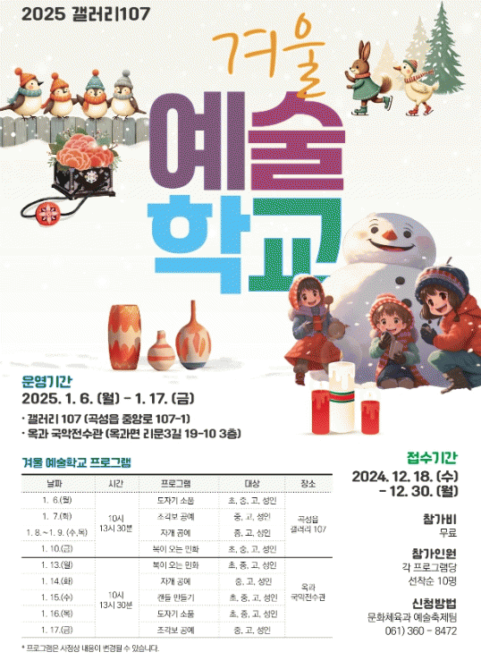À̹ø °Ü¿ï ¿¹¼úÇб³´Â ³»³â 2025³â 1¿ù 6ÀϺÎÅÍ 17ÀϱîÁö °î¼ºÀ¾ Á߾ӷο¡ À§Ä¡ÇÑ ¡®°¶·¯¸® 107¡¯°ú ¿Á°ú¸é »ç¶Ç°ñ ¹®È¼¾ÅÍ 3Ãþ ¡®±¹¾ÇÀü¼ö°ü¡¯¿¡¼ ÁøÇàÇÏ¸ç °Ü¿ï ¹æÇÐ µ¿¾È Áö¿ª û¼Ò³â°ú ¼ºÀÎ µî 200¸íÀ» ´ë»óÀ¸·Î ´Ù¾çÇÑ ¿¹¼ú Á¶Çü °æÇèÀ» Á¦°øÇÑ´Ù.