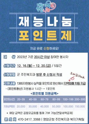 ÀÚ¿øºÀ»ç Ȱµ¿ ½Ã°£À» Æ÷ÀÎÆ®·Î ÀüȯÇϰí, Áö¿ªÈÆó·Î Áö±ÞÇÏ´Â ³»¿ëÀ¸·Î ÀÚ¿øºÀ»ç¶ó´Â »çȸÀû °¡Ä¡¸¦ âÃâÇϰí, Áö¿ª°æÁ¦ Ȱ¼ºÈ¿¡µµ ±â¿©ÇÑ´Ù´Â ÃëÁö¿¡¼´Ù.