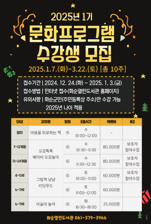 È­¼ø ¿­¸°µµ¼­°ü 2025³â 1±â ¹®È­ÇÁ·Î±×·¥Àº ¡ã¸¶À½À» À§·ÎÇϴ å(ÀÏ¹Ý ´ë»ó) ¡ã¿À°¨ÅåÅå ¾Æ±â ¿À°¨ ³îÀÌ(À¯¾Æ ´ë»ó, 2°³ °­ÁÂ) ¡ã±×¸²Ã¥ ³È³È ¿ä¸®(À¯¾Æ ´ë»ó, 2°³ °­ÁÂ) ¡ã¹Ì¼ú·Î ³îÀÚ(À¯¾Æ ´ë»ó)À̸ç, 6°³ °­Á¿¡¼­ ÃÑ 65¸íÀ» ¸ðÁýÇÑ´Ù.