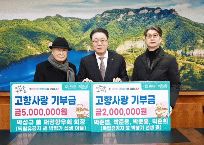 ¹Ú¼º±Ô Àü ȸÀåÀº Áö³ÇØ¿¡ À̾î 2³â ¿¬¼ÓÀ¸·Î ¿ÃÇØµµ ȼø±º¿¡ °íÇâ»ç¶û±âºÎ±Ý ÃÖ°í¾×ÀÎ 500¸¸¿øÀ» ±âºÎÇÏ¸ç °íÇâ ¹ßÀüÀ» ¹Ù¶ó´Â ¶æ±íÀº ±âºÎ¸¦ À̾´Ù.