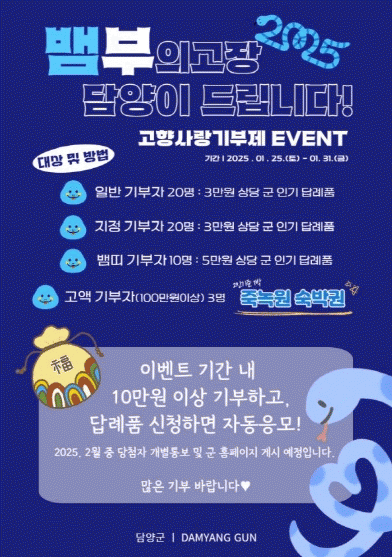 À̹ø À̺¥Æ®´Â 1¿ù 25ÀϺÎÅÍ 31ÀϱîÁö ÁøÇàµÇ¸ç, ±â°£ ³» ´ã¾ç±º¿¡ 10¸¸ ¿ø ÀÌ»ó °íÇâ»ç¶û±âºÎÀÚ¸¦ ´ë»óÀ¸·Î ÀϹݱâºÎ(ÀÚÄ¡´Üü¿¡ ±âºÎÇϱâ) Âü¿©ÀÚ ¹× ÁöÁ¤±âºÎ(ƯÁ¤ »ç¾÷¿¡ ±âºÎÇϱâ) Âü¿©ÀÚ¸¦ °¢ 20¸í¾¿ Ãß÷ÇÑ´Ù.