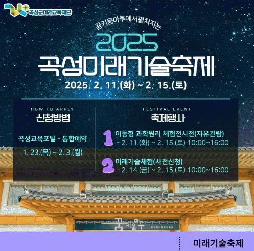 ¹Ì·¡±â¼úüÇè Âü¿© ½ÅûÀº 1¿ù 23ÀÏ 10½ÃºÎÅÍ 2¿ù 3ÀϱîÁö °î¼º±³À°Æ÷Åп¡¼ ¼±Âø¼øÀ¸·Î Á¢¼öÇÒ ¿¹Á¤ÀÌ´Ù.