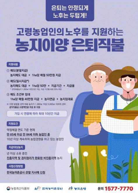 ³óÁöÀ̾çÀºÅðÁ÷ºÒ»ç¾÷Àº °í·É³ó¾÷ÀÎ(¸¸ 65~84¼¼)ÀÌ ³óÁö¸¦ ¸ÅµµÇÏ°í ³ó¾÷ÀºÅ𸦠ÇÒ ¶§ ¸Å¿ù ÀÏÁ¤ ±Ý¾×ÀÇ Á÷ºÒ±ÝÀ» Áö±ÞÇÏ´Â »ç¾÷ÀÌ´Ù.