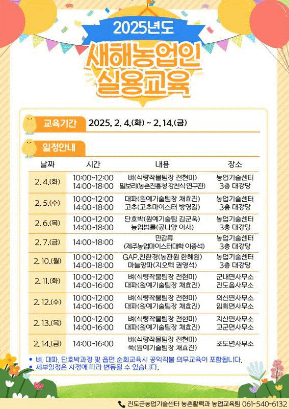 ÇÑÆí ±³À° ÀÏÁ¤Àº Áøµµ±º³ó¾÷±â¼ú¼¾ÅÍ ´©¸®Áý(ȨÆäÀÌÁö)¿¡¼ È®ÀÎÇÒ ¼ö ÀÖÀ¸¸ç, ÀÚ¼¼ÇÑ ³»¿ëÀº ³óÃÌȰ·Â°ú ³ó¾÷±³À°ÆÀ(¢Ï540-6132)À¸·Î ¹®ÀÇÇÏ¸é µÈ´Ù.