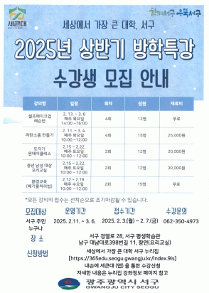 À̹ø ¹æÇРƯ°Àº Á¤±Ô ÇÁ·Î±×·¥ÀÌ ¾ø´Â °èÀýÇб⠱Ⱓ¿¡ ±³À° °ø¹éÀ» ÇØ¼ÒÇϰí ÁֹεéÀÇ ÇнÀ ¼ö¿ä¸¦ ÃæÁ·½Ã۱â À§ÇØ ¸¶·ÃµÆ´Ù. ¿î¿µ ±â°£Àº 2¿ù 11ÀϺÎÅÍ 3¿ù 6ÀϱîÁö 3ÁÖ°£À̸ç, ¼ö° ½ÅûÀº 2¿ù 7ÀϱîÁö ¡®¼¼Å«´ë¡¯ ´©¸®Áý ¶Ç´Â ¡°³»¼Õ¿¡ ¼¼Å«´ë¡± ¾ÛÀ» ÅëÇØ ÇÒ ¼ö ÀÖ´Ù.