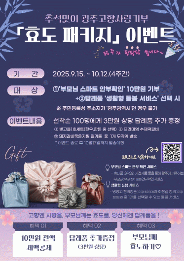 ±¤ÁÖ±¤¿ª½Ã´Â ¿À´Â 10¿ù12ÀϱîÁö °íÇâ»ç¶û±âºÎÁ¦ Âü¿©¸¦ µ¶·ÁÇÏ°í ºÎ¸ð´Ô µ¹º½¼ºñ½º ÀÌ¿ëÀ» Àå·ÁÇϱâ À§ÇØ ¡®Ãß¼®¸ÂÀÌ È¿µµÆÐŰÁö À̺¥Æ®¡¯¸¦ ÁøÇàÇÑ´Ù.