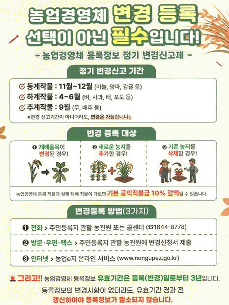 ±×·¯³ª ¿ÃÇØ±îÁö´Â Á¤±âº¯°æ ½Å°í °èµµ±â°£À¸·Î ¿î¿µÇÏ°í ³»³âºÎÅÍ´Â Á÷ºÒ±Ý µîÀÌ °¨¾×µÉ ¼ö ÀÖÀ¸¹Ç·Î ³ó¾÷°æ¿µÃ¼ µî·ÏÁ¤º¸ÀÇ º¯°æµî·ÏÀÌ ÇʼöÀûÀÌ´Ù.