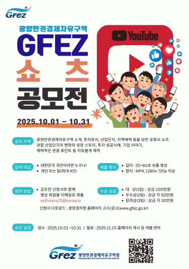 [¹Ìµð¾îÀü³² Á¦°¥´ëÁ¾ ±âÀÚ]±¤¾ç¸¸±Ç°æÁ¦ÀÚÀ¯±¸¿ªÃ»(ûÀå ±¸Ãæ°ï)Àº 10¿ù 1ÀϺÎÅÍ 31ÀϱîÁö ±¹¹Î Âü¿©Çü ¡®2025 GFEZ À¯Æ©ºê ¼îÃ÷ °ø¸ðÀü¡¯À» °³ÃÖÇÑ´Ù°í ¹àÇû´Ù.