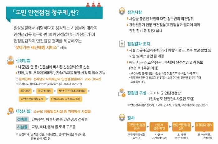 ¾ÈÀüÁ¡°Ë ¿äûÀÌ Á¢¼öµÇ¸é °ø¹«¿ø°ú ¹Î°£Àü¹®°¡·Î ±¸¼ºµÈ ÇÕµ¿Á¡°Ë¹ÝÀÌ ½ÅûÀΰú ÀÏÁ¤ ÇùÀÇ ÈÄ Á÷Á¢ ÇöÁö¸¦ ¹æ¹®ÇØ ¹«·á·Î ¾ÈÀüÁ¡°ËÀ» ½Ç½ÃÇϰí, ½Ã¼³¹° ¼ÒÀ¯ÁÖ(°ü¸®ÁÖü)¿¡°Ô À§ÇèÀÇ Á¤µµ, º¸¼ö¡¤º¸° ¹æ¹ý µîÀ» Á¦¾ÈÇÑ´Ù.