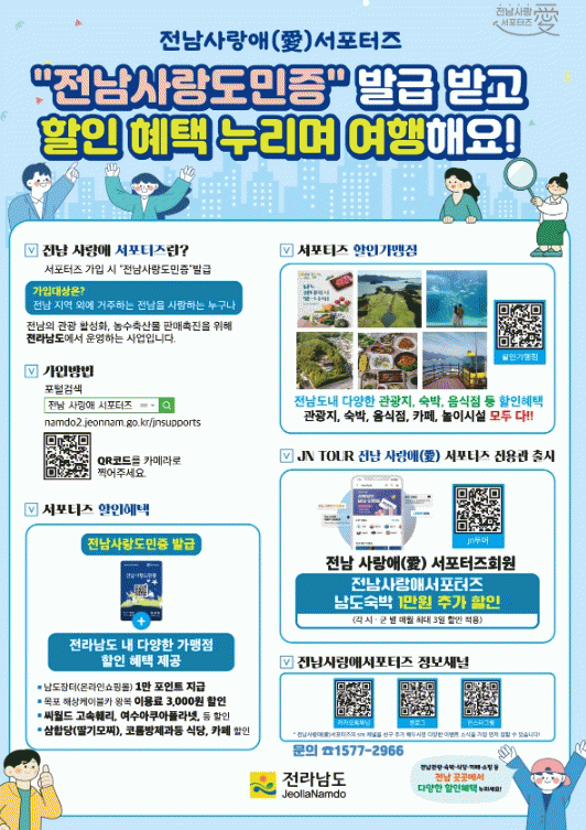 Àü³² »ç¶û¾Ö ¼Æ÷ÅÍÁî´Â Áö¿ª ¼Ò¸ê À§±â¸¦ ±Øº¹ÇÏ°í ³óÆ¯»ê¹° ÆÇ¸Å ÃËÁø, °ü±¤ Ȱ¼ºÈ¸¦ À§ÇØ Áö³ 2022³â 9¿ùºÎÅÍ ¿î¿µµÇ°í ÀÖ´Ù. °¡ÀÔÀÚ¿¡°Ô´Â Àü³² µµ³» °ü±¤Áö, ¼÷¹Ú, À½½ÄÁ¡, ÀüÅë½ÃÀå µî ÇÒÀΰ¡¸ÍÁ¡¿¡¼ ÇÒÀÎ ÇýÅÃÀ» ¹ÞÀ» ¼ö ÀÖ´Â ¡®Àü³²»ç¶ûµµ¹ÎÁõ¡¯ÀÌ ¹ß±ÞµÈ´Ù.