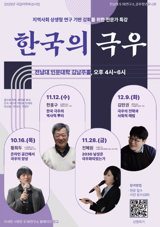 15ÀÏ Àü³²´ë¿¡ µû¸£¸é, Àü³²´ëÇб³ 5¡¤18¿¬±¸¼Ò´Â ÀÌ´ÞºÎÅÍ ¿À´Â 12¿ù±îÁö ÃÑ 4Â÷·Ê¿¡ °ÉÃÄ ¡®Çѱ¹ÀÇ ±Ø¿ì¡¯¸¦ ÁÖÁ¦·Î ÇÑ ¿¬¼Ó °­¿¬À» ÁøÇàÇÑ´Ù.
