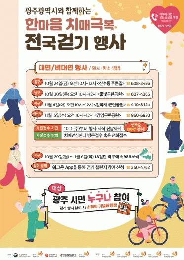 ÀÌ Çà»ç´Â ±¤ÁÖ½Ã¿Í Àü³²´ëÇб³º´¿ø, ±¤ÁÖ±¤¿ªÄ¡¸Å¼¾ÅͰ¡ °øµ¿ÁÖÃÖÇϰí 5°³ ÀÚÄ¡±¸ º¸°Ç¼Ò Ä¡¸Å¾È½É¼¾ÅͰ¡ ÁÖ°üÇÑ´Ù. ÇÁ·Î±×·¥Àº ¡ãÄ¡¸Å¿¹¹æÃ¼Á¶ ¡ã¹Ù¸£°Ô °È±â ¹æ¹ý ¾È³» ¡ã´À¸®°Ô °È±â üÇè µîÀ¸·Î ±¸¼ºµÆÀ¸¸ç, ´Ù¾çÇÑ Ä¡¸Å¿¹¹æ È«º¸È°µ¿µµ ÁøÇàµÈ´Ù. Çà»ç ´çÀÏ °È±â ±¸°£À» ¿ÏÁÖÇÑ Âü°¡ÀÚ¿¡°Ô´Â ¼ÒÁ¤ÀÇ ±â³äǰÀÌ Á¦°øµÈ´Ù.