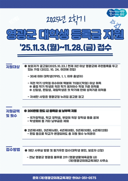 ½ÅûÀº 2025³â 11¿ù 3ÀϺÎÅÍ 11¿ù 28ÀÏ 18:00±îÁöÀ̸ç, Á¢¼öó´Â ¿µ±¤±º¹Ì·¡±³À°Àç´Ü »ç¹«½Ç·Î ¹æ¹® ¶Ç´Â ¿ìÆí Á¢¼ö°¡ °¡´ÉÇÏ´Ù.