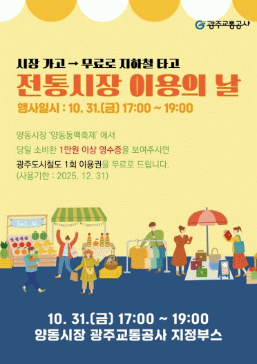 À̹ø À̺¥Æ®´Â ±¤ÁÖÀÇ ´ëÇ¥ Áñ±æ °Å¸®ÀÎ ¡®¾çµ¿Åë¸ÆÃàÁ¦¡¯¿Í ¿¬°èÇØ ÁøÇà µÇ¸ç, °ø»ç´Â 10¿ù 31ÀÏ ±Ý¿äÀÏ ¿ÀÈÄ 5½ÃºÎÅÍ 7½Ã±îÁö ÃàÁ¦ ÇöÀå¿¡¼ ´çÀÏ 1¸¸¿ø ÀÌ»óÀ» ±¸¸ÅÇÑ °í°´¿¡°Ô ¿À´Â 12¿ù 31ÀϱîÁö »ç¿ë °¡´ÉÇÑ µµ½Ãöµµ 1ȸ ¹«·á ÀÌ¿ë±ÇÀ» ÁõÁ¤ÇÑ´Ù.