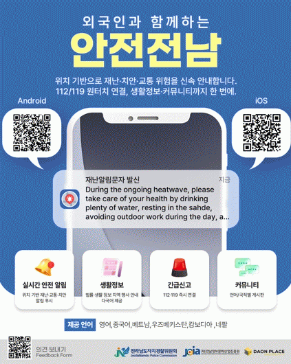 [¹Ìµð¾îÀü³² Á¦°¥´ëÁ¾ ±âÀÚ]Àü¶ó³²µµÀÚÄ¡°æÂûÀ§¿øÈ¸´Â Àü³² ü·ù ¿Ü±¹ÀÎÀÇ ¾ÈÀü »ç°¢Áö´ë¸¦ ÇØ¼ÒÇÏ°í ¾ð¾î À庮¿¡ µû¸¥ Àç³­À̳ª ¹üÁË ´ëÀÀÀÇ ¾î·Á¿òÀ» ÁÙÀ̱â À§ÇØ ¡®´Ù±¹¾î ¾ÈÀüÀü³²¡¯ ¾ÛÀ» °³¹ß, º»°Ý ¼­ºñ½ºÇÑ´Ù°í ¹àÇû´Ù.