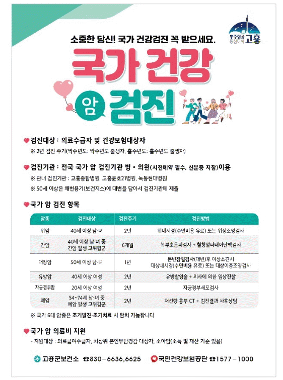 ±¹°¡¾Ï°ËÁø ¹× ÀÇ·áºñ Áö¿ø¿¡ °üÇÑ ÀÚ¼¼ÇÑ »çÇ×Àº °íÈﱺ º¸°Ç¼Ò Áö¿ªº¸°ÇÆÀÀ¸·Î ¹®ÀÇÇÏ¸é ¾È³»¹ÞÀ» ¼ö ÀÖ´Ù.
