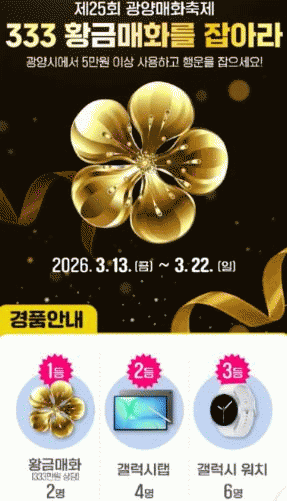 Ãß÷À» ÅëÇØ 333¸¸ ¿ø »ó´çÀÇ È²±Ý¸ÅÈ­(2¸í)¸¦ ºñ·ÔÇØ °¶·°½ÃÅÇ, °¶·°½Ã¿öÄ¡ µî ´Ù¾çÇÑ °æÇ°ÀÌ Á¦°øµÈ´Ù.
