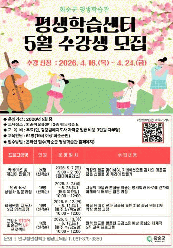 À̹ø ÇÁ·Î±×·¥Àº ±º¹ÎÀÇ °ü½É°ú ¼ö¿ä¸¦ ¹Ý¿µÇÑ »ýȰ ¹ÐÂøÇü °Á·Π¡ãÄ«³×ÀÌ¼Ç ²É ij¸®¾î ¸¸µé±â ¡ã¸í¸®¡¤Å¸·Î »ó´ã»ç ÀÔ¹® °úÁ¤ ¡ãÈú¸µ¿ø¿¹Áöµµ»ç 2±Þ ¾ç¼º°úÁ¤ ¡ã±Ù°¨¼ÒÁõ ¿¹¹æ ¿îµ¿ ÇÁ·Î±×·¥ µîÀ¸·Î ±¸¼ºµÆ´Ù.